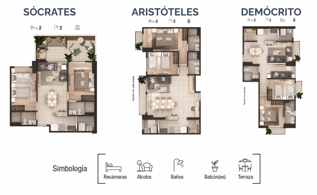 * Existencia de balcón(es) y/o alcoba según prototipo. * Los m2 expresados incluyen balcones y/o terrazas en su caso. * Las Imágenes son ilustrativas. La forma y distribución de los departamentos puede variar.